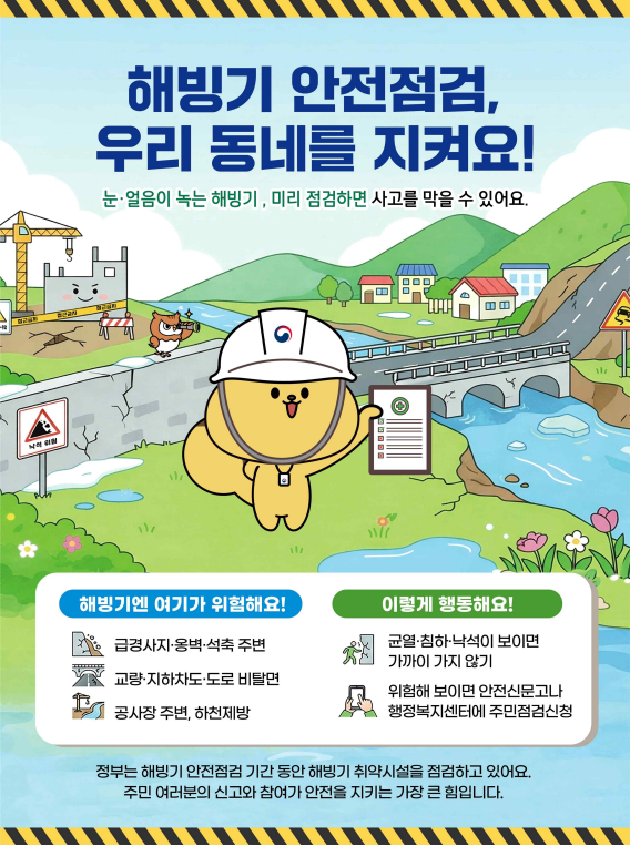 특히, 올해부터는 주민점검신청제 실시로 주민들이 해빙기 생활주변의 취약시설을 직접 신고할 수 있다.