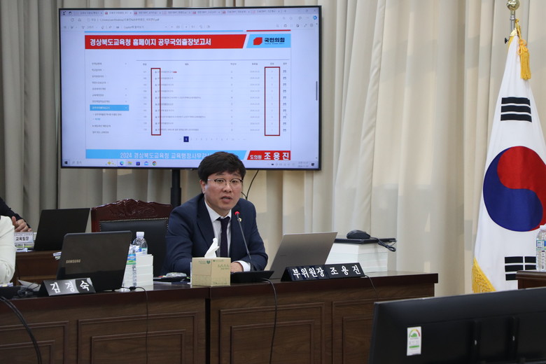 [경북 세계타임즈=한윤석 기자] 경북도의회 조용진 도의원(김천3, 교육위원회 부위원장)은 2024. 11. 7.(목) 경북도교육청 행정사무감사에서 도교육청으로부터 제출한 자료를 분석한 결과 도교육청의 부실한 공무 국외연수 관리에 대해 날카롭게 지적하고, 시정 요구했다.