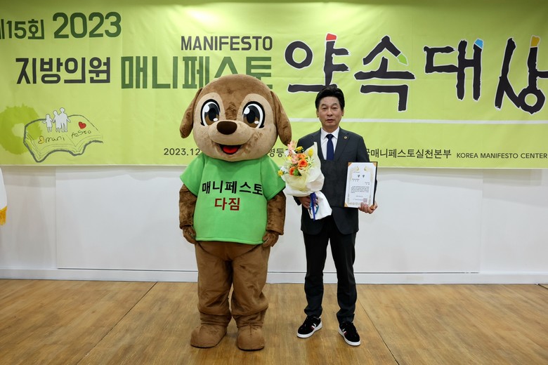 ‘지방의원 매니페스토 약속대상’은 지방의회 역량 강화 및 주민 신뢰 기반 구축을 위해 한국매니페스토가 주관하였으며, 공약이행 분야와 좋은조례 분야로 나누어 공모했다.