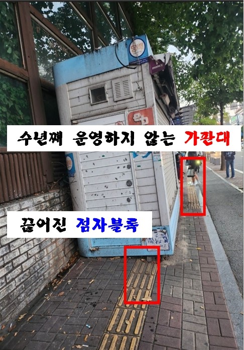 이 시설물 중 이의원이 행정사무감사를 통해 지적한 곳은 구월동에 위치한 곳으로 교통카드 충전, 판매 등을 주된 목적으로 하는 가로판매대로 운영하던 곳이다. 그러나 “2018년 이후 수년간 가판대 운영에 대한 도로점용료를 납부하지 않고 있으며, 수년째 문을 닫고 영업하지 않고 있는데도 도로관리청인 구에서는 어떠한 행정조치도 하지 않았으며, 더구나 이 가판대는 점자블록을 막고 있어 시각장애인들의 보행에 불편을 초래하고 있다”라고 지적했다.