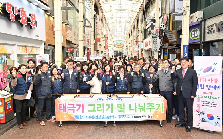 이날 한국자유총연맹 울산중구지회 회원 80여 명은 주민들에게 태극기를 나눠주며 3.1절 태극기 게양을 독려했다.