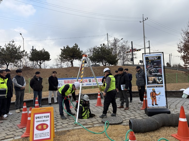 [화성시 세계타임즈=송민수 기자] 화성특례시(시장 정명근)가 지난 10일 정남면수질복원센터 밀폐공간 사고 훈련장에서 ‘2025년 하반기 하수관 밀폐공간 질식사고 비상 대응훈련’을 실시했다.