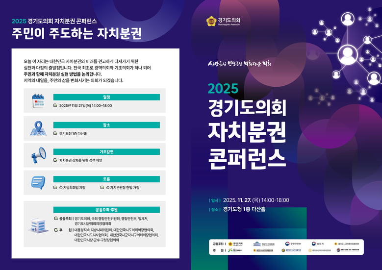 ○ 자치분권 실현 위한 사회적 공감대 확산 및 지방자치 발전 방향 모색 예정 [경기도 세계타임즈=송민수 기자] 경기도의회(의장 김진경)가 진정한 자치분권 실현에 대한 사회적 공감대 확산과 향후 지방자치의 발전 방향 모색을 위한 「2025 경기도의회 자치분권 콘퍼런스」를 오는 11월 27일 목요일 경기도청 다산홀에서 개최한다.