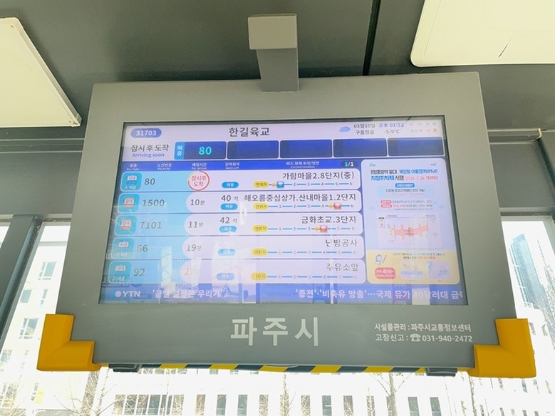아울러 파주시는 2026년부터 2030년까지 5년간 총 7,956백만 원을 투입해 버스정보안내기 269대를 신규 설치하고 노후 장비 394대를 교체하는 등 총 663대를 단계적으로 확충할 계획이다.