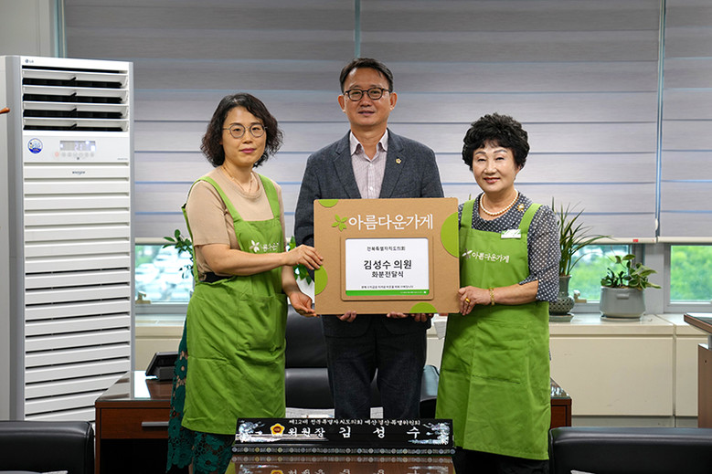 김성수 의원은 8일 도의회 예산결산특별위원회 위원장실에서 사회적 기업인 아름다운가게 전북본부 김진형 공동대표와 오현주 본부장에게 화분 40여 개를 전달했다.