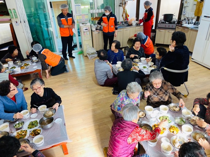 경남아파트 경로당 주용식 총무는 “오늘 추운날씨에 사랑의 사다리 밴드에서 삼계탕 닭죽 묵무침 부침개를 지원해 주어서 큰힘과 위안이 된다.”면서 감사함을 전했다.