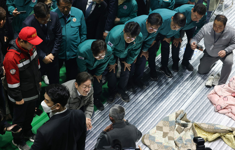 [세계타임즈 = 심귀영 기자] 더불어민주당 이재명 대표가 26일 오후 경북 안동시 안동체육관에 마련된 산불 대피시설을 찾아 이재민을 위로하고 있다. 이 대표는 이날 공직선거법위반 혐의 항소심 무죄 선고 후 첫 일정으로 이곳을 찾았다. 2025.3.26 [공동취재]