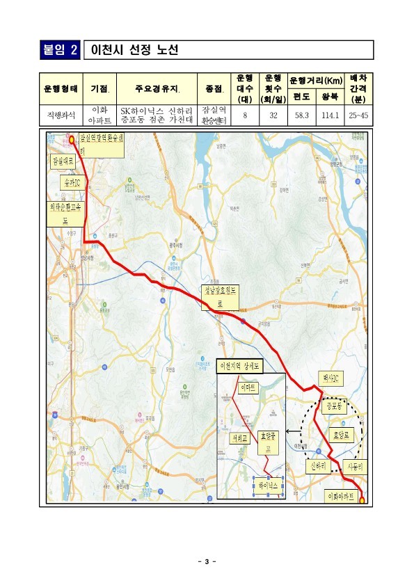 이번에 선정된 ‘부발읍~잠실역’ 노선은 SK하이닉스·사음동·갈산지구·증포동 등 이천 주요 생활권을 직결해 서울 잠실역으로 연결하는 첫 광역버스 노선이라는 점에서 의미가 크다. 이천시는 그동안 서울 접근성이 취약해 시민 불편이 꾸준히 제기돼 왔으며, 특히 부발·사음·갈산지구 등 이천 신도심 지역의 통근 수요가 급증하면서 광역 교통망 확충이 절실했다.