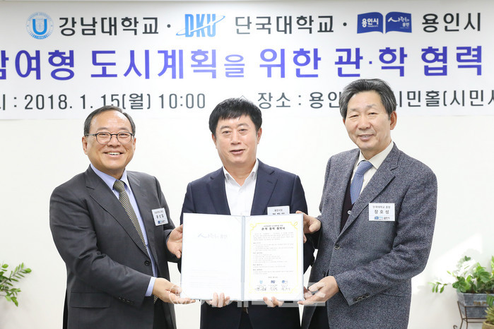 이번 협약은 강남대 윤신일 총장, 단국대 장호상 총장, 용인시 정찬민 시장이 함께 용인시 도시정책의 발굴과 교육 및 연구 등 업무 교류에 필요한 사항을 상호 지원하고 협력하기 위해 마련됐다.