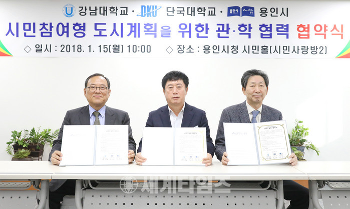 [용인시=세계타임즈 이영진 기자] 강남대학교(총장 윤신일)는 15일 오전 10시 용인시청 시장실에서 용인시청, 단국대와 참여형 도시계획 및 부동산 관련 업무를 위한 관·학 업무협약을 체결했다.