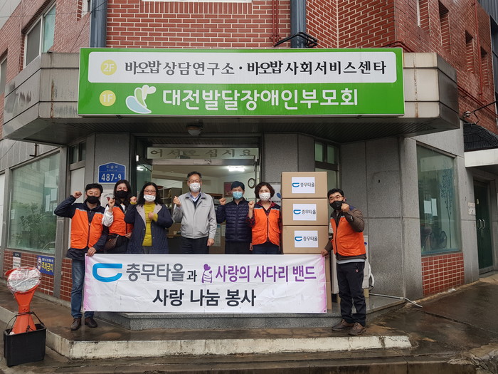 [대전=세계타임즈 이채봉 기자] 9천명 SNS 대전시 봉사단체 사랑의 사다리 밴드(리더 이정제)는 19일 오전11시, 서구 탄방동에 위치한 대전발달장애인부모회(회장 김명숙)에 충무타올 200장을 전달하면서 우리 사회의 따뜻한 사랑을 실천하였다.