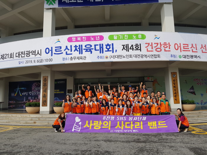 [대전=세계타임즈 이장성 기자] 대전시 소외계층을 위해서 다양한 봉사활동을 실천하고 있는 대전시 SNS 8천명 봉사단체 사단법인 사랑의 사다리 밴드(리더 이정제)는 6일 오전10시, 대전 충무체육관에서 대한노인회 대전시연합회(회장 이철연) 주관으로 개최된 제21회 대전시어르신체육대회에서 행사 보조 봉사로 사회적 효행을 실천 하였다.