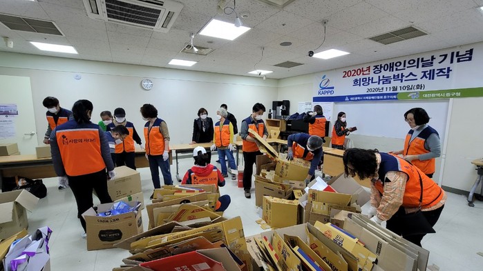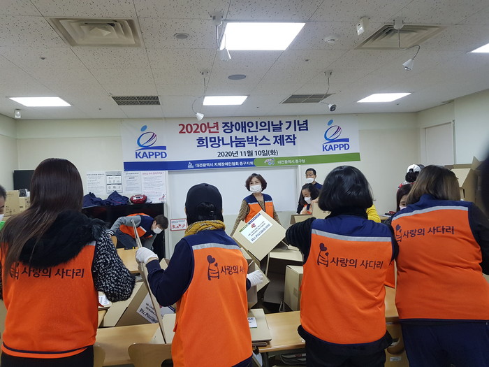 김채린 중구지체장애인협회장은 “오늘 사랑의 사다리 밴드 봉사단체에서 희망나눔 500박스 포장 봉사를 지원해주어서 큰 힘과 위안이 된다.”면서 감사함을 전했다.