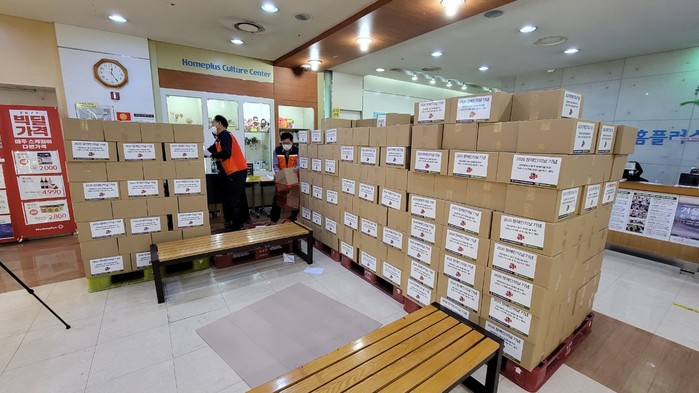 이날 봉사에는 유희자 단장,한철웅 단장을 비롯해서 회원 20명이 짜장, 카레, 라면, 물휴지,마스크 등 9개 생필품을 희망 나눔 500개 박스에 포장 봉사를 하였다.