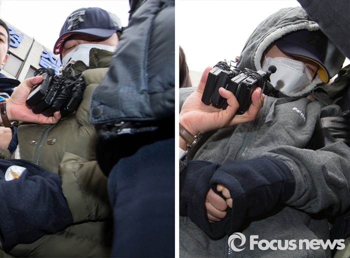 (부천=포커스뉴스) 부천 초등생 토막사건의 피의자 최모 씨(왼쪽)와 한모 씨가 사체손괴·유기와 아동보호법 위반 혐의로 22일 오후 경기 부천시 원미경찰서에서 검찰로 송치되고 있다.