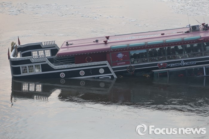 (서울=포커스뉴스) 26일 오후 서울 한강 영동대교 아래에서 한강유람선이 침수돼 구조대원들이 구조활동과 견인 작업을 하고 있다.