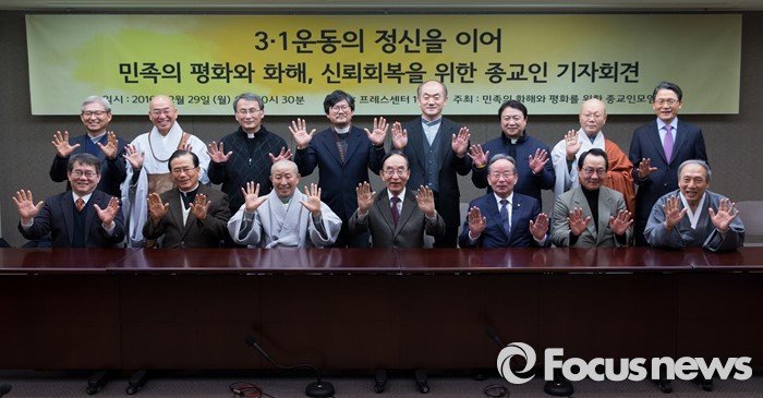 (서울=포커스뉴스) 29일 오후 서울 중구 프레스센터에서 '3.1 운동의 정신을 이어 민족의 평화와 화해, 신뢰회복을 위한 종교인 기자회견'에 참석한 개신교, 불교, 천주교, 원불교, 천도교 성공회 종교인들이 기념촬영을 하고 있다.