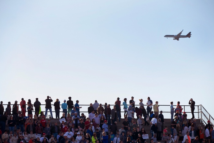 도널드 트럼프를 태운 비행기가 28일 앨라배마 주 매디슨의 학교 체육관에 집결한 지지자들 위로 날아가고 있다.(Photo by Scott Olson/Getty Images)