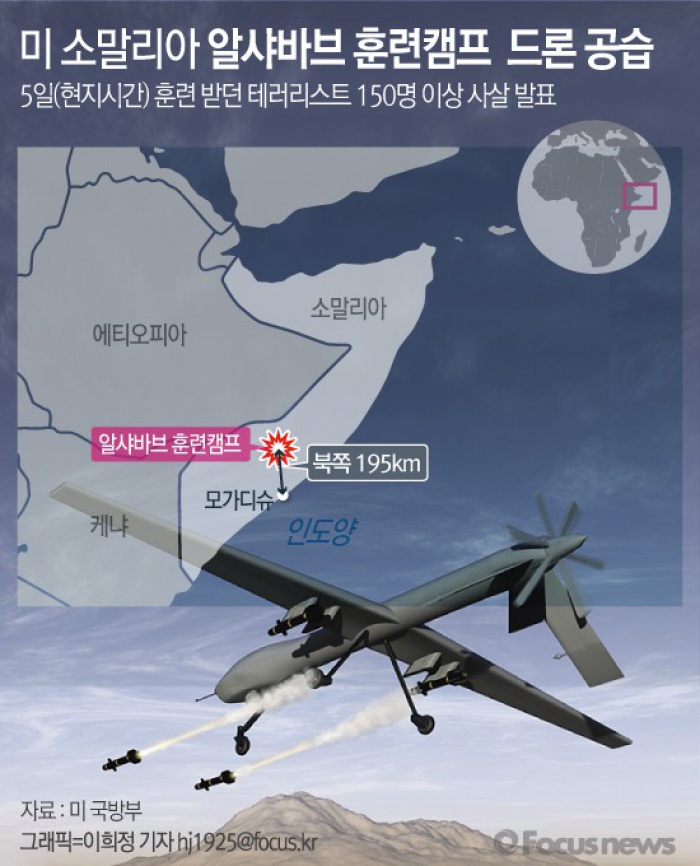 (서울=포커스뉴스) 미 국방부에 따르면 미군 드론이 지난 5일(현지시간) 소말리아 모가디슈 북쪽 195km 떨어진 알샤바브 훈련캠프를 공격해 최소 150명 이상의 사망자가 발생했다고 7일 발표했다.