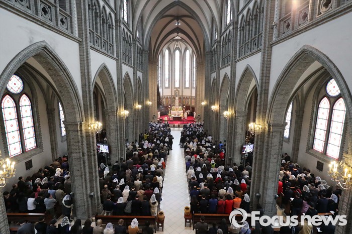 (서울=포커스뉴스) 부활절을 맞아 27일 정오 서울 중구 명동성당에서 열린 '예수 부활 대축일 미사'에 신도들이 참석해 기도하고 있다.