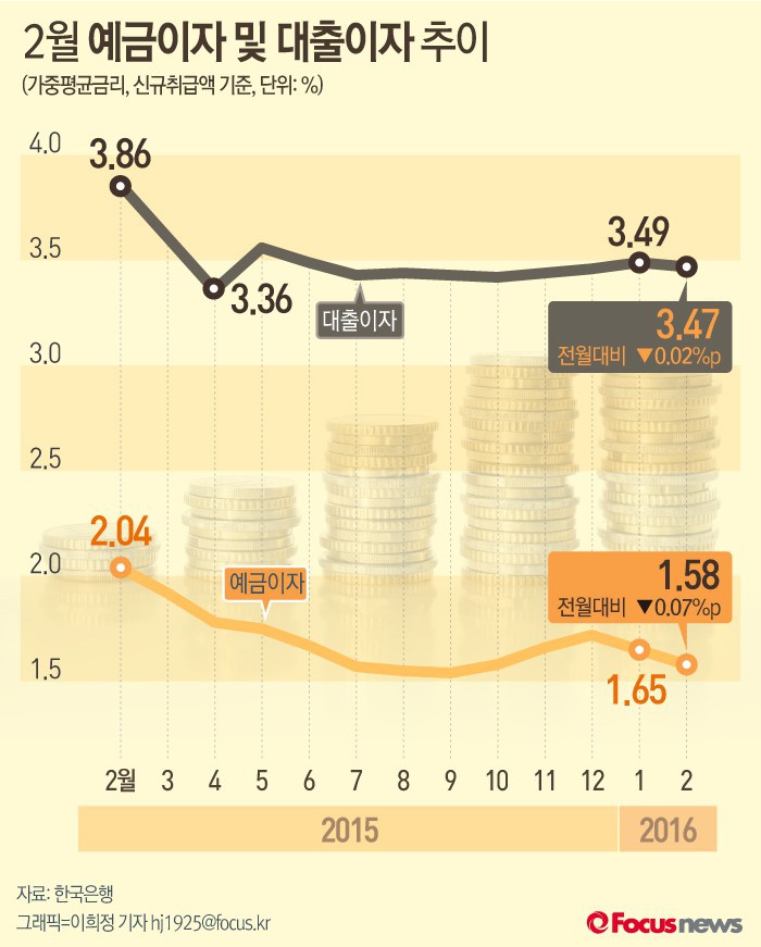 (서울=포커스뉴스) 한국은행이 28일 낸 ‘2월 중 금융기관 가중평균금리’에 따르면 2월 대출금리는 3.47%였다. 예금은행의 신규취급액기준 저축성수신금리는 1.58%로 전월대비 0.07%포인트 떨어졌다.