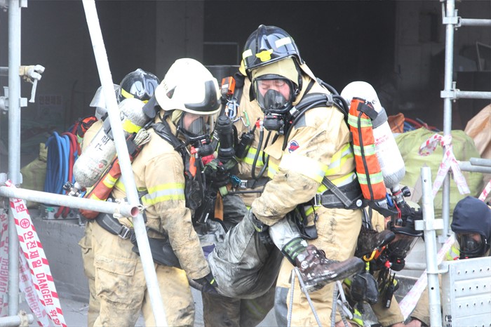 (서울=포커스뉴스) 28일 오후 서울 강서구 마곡동 한 오피스텔 공사장에서 화재가 발생, 강서소방서 대원들이 현장에 있던 근로자들을 구조하고 있다. <사진제공=강서소방서>