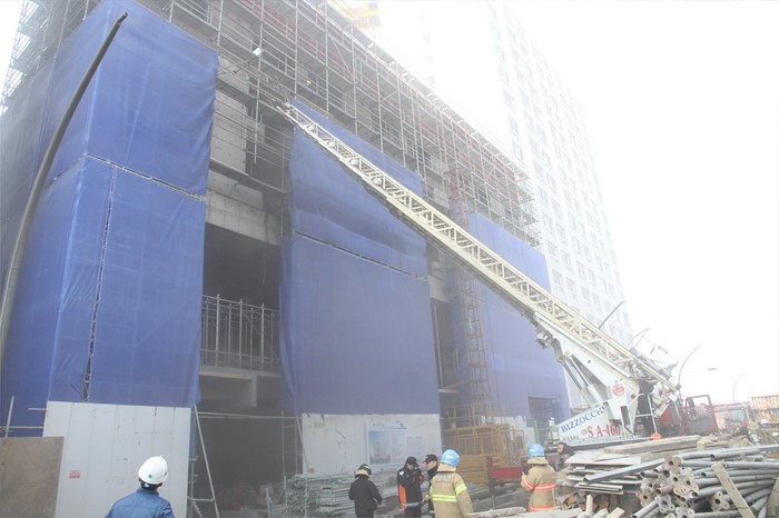 (서울=포커스뉴스) 28일 오후 서울 강서구 마곡동 한 오피스텔 공사장에서 화재가 발생, 강서소방서 대원들이 화재진압을 하고 있다. <사진제공=강서소방서>