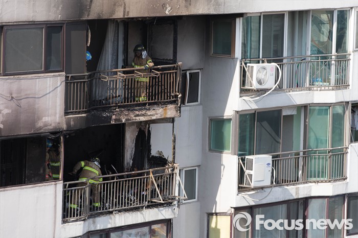 (서울=포커스뉴스) 30일 오후 2시께 서울 서초구의 한 아파트에서 원인모를 불이나 소방관들이 진화작업을 하고 있다.
