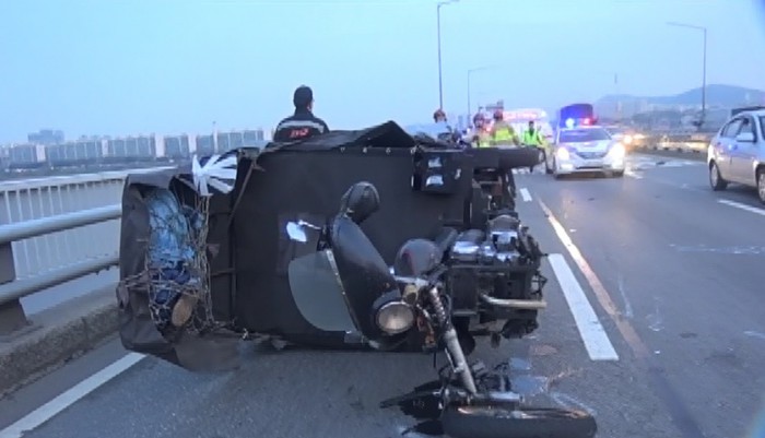(서울=포커스뉴스) 6일 오전 5시 57분쯤 서울 용산구 반포대교에서 서초방면으로 향하던 택시가 오토바이를 뒤에서 추돌하는 사고가 일어났다.