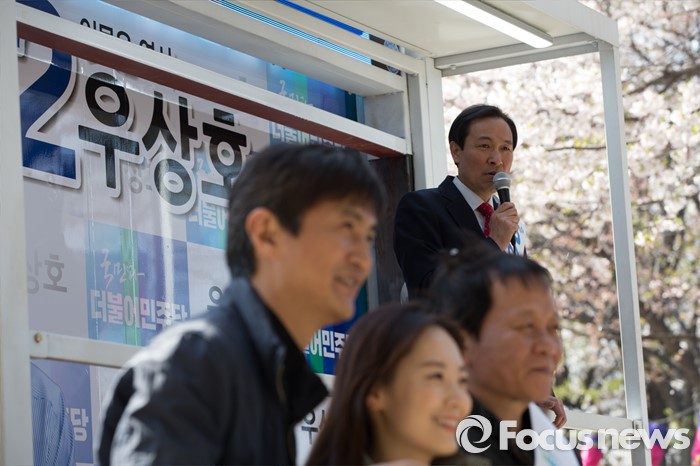 (서울=포커스뉴스) 11일 오후 서울 서대문구 청소년수련관 앞에서 우상호 더불어민주당 서대문구갑 후보가 영화배우 안내상, 우현과 함께 유세를 하고 있다.