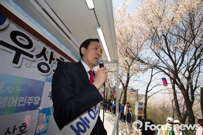 (서울=포커스뉴스) 11일 오후 서울 서대문구 청소년수련관 앞에서 우상호 더불어민주당 서대문구갑 후보가 시민들에게 지지를 호소하고 있다.