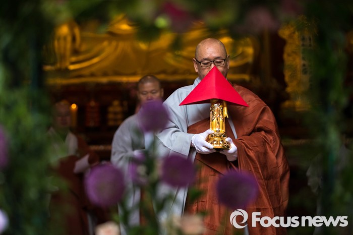 (서울=포커스뉴스) 21일 오전 서울 종로구 조계사에서 관불의식이 열리고 있다. 관불은 불교의식으로 탄생불의 형상에 물을 부어 씻겨 자신의 마음에 쌓인 죄와 번뇌를 맑고 깨끗하게 만들어 복을 누리게 된다고 알려진 의식이다.