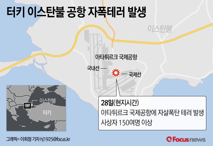(서울=포커스뉴스) 28일(현지시간) 터키 이스탄불 아타튀르크 국제공항에서 자살 폭탄테러로 150여명이 넘는 사상자가 발생했다. 이번 테러는 올해 이스탄불에서 발생한 네번째 테러다.
