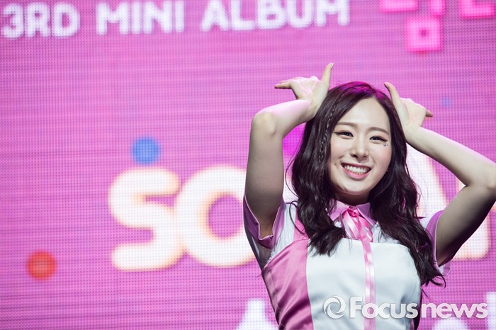 (서울=포커스뉴스) 29일 오전 서울 마포구 예스24 무브홀에서 열린 걸그룹 소나무의 미니앨범 '넘나 좋은 것' 쇼케이스에 참여한 멤버 민재가 포토타임을 갖고 있다.