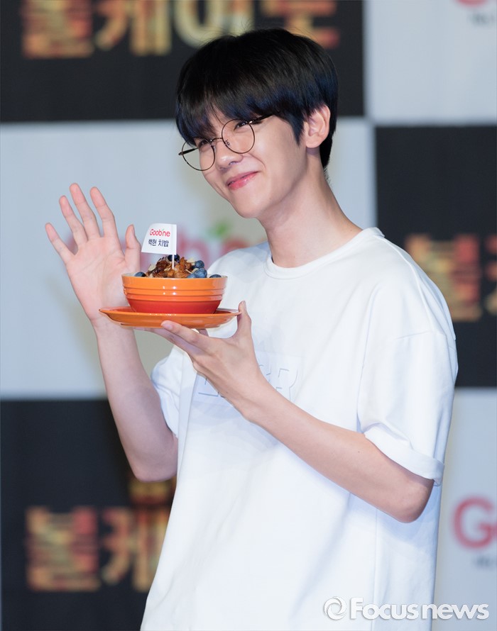 (서울=포커스뉴스) 29일 오후 서울 강남구 일지아트홀에서 열린 '굽네 볼케이노와 함께하는 엑소(EXO) 치밥 쿠킹 팬사인회'에서 백현이 포즈를 취하고 있다.
