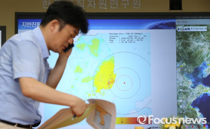 (대전=포커스뉴스) 6일 오전 대전 유성구 한국지질자원연구원 지진연구센터에서 직원들이 지진상황을 모니터 하며 분주한 모습을 보이고 있다. 지난 5일 오후 8시 33분께 울산 동구 동쪽 52㎞ 해상에서 규모 5.0의 지진이 발생했다.