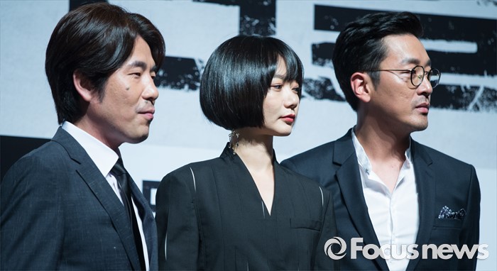 (서울=포커스뉴스) 7일 오전 서울 강남구 압구정 CGV에서 열린 영화 '터널' 제작보고회에 참석한 배우 오달수(왼쪽부터), 배두나, 하정우가 포토타임을 갖고 있다.