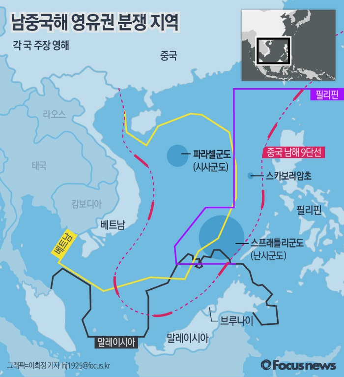 (서울=포커스뉴스) 남중국해 부근은 중국과 베트남, 필리핀, 말레이시아 등이 서로 영유권을 주장하고 있는 분쟁지역이다.