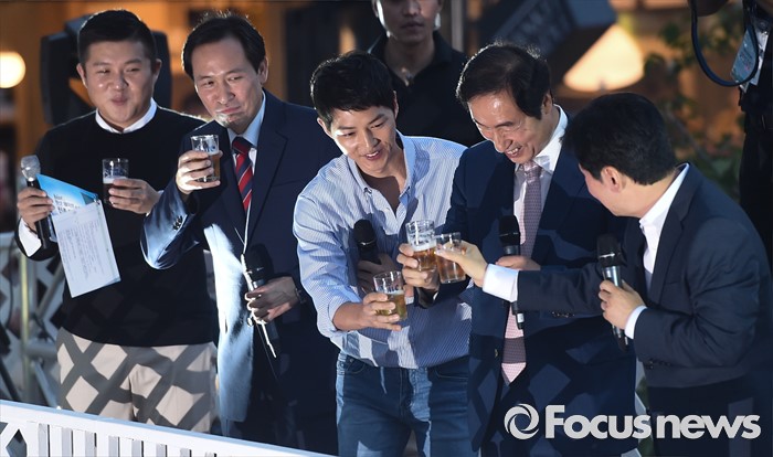 (서울=포커스뉴스) 14일 오후 서울 서대문구 신촌 일대에서 열린'제2회 신촌맥주축제'에 참석한 배우 송중기를 비롯한 참석자들이 건배하고 있다. 왼쪽부터 개그맨 양세호, 우상호 더불어민주당 원내대표, 배우 송중기, 문석진 서대문구청장.