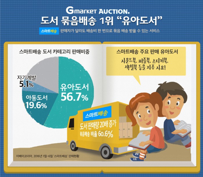 1일 G마켓과 옥션을 운영하는 이베이코리아에 따르면 올 상반기 묶음배송 서비스 '스마트배송' 판매현황을 집계한 결과 도서 카테고리 중 유아도서의 묶음배송 수요가 가장 높았다. 스마트배송은 1회 배송비로 묶음 배송을 받을 수 있는 서비스다.