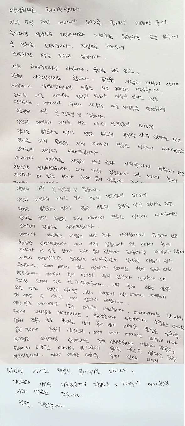 최여진은 "어머니가 당신의 시각으로 다른 사람들을 판단하려 했던 것이 가장 큰 잘못인 것 같습니다. 어머니가 기 선수를 지목해 쓴 글과 사과문을 뒤늦게 보고 참담한 심정이었습니다. 가장 집중해야 할 시기에 혹여 기 선수가 이 글을 보거나 전해 듣지 않을까 죄송스러운 마음과 함께 대표 선수들을 응원하는 한 사람으로서 불안한 마음이 먼저 들었습니다"라고 덧붙였다.