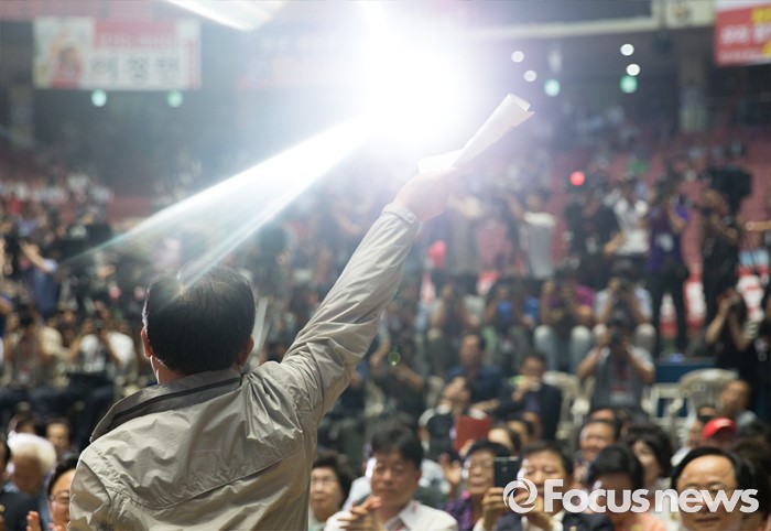 (서울=포커스뉴스) 9일 오후 서울 송파구 잠실실내체육관에서 열린 제4차 새누리당 전당대회에서 이정현 후보가 개표에 앞서 당원들에게 인사를 하고 있다.