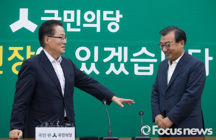 (서울=포커스뉴스) 11일 오후 서울 여의도 국회에서 박지원(왼쪽) 국민의당 비상대책위원장이 이정현 새누리당 대표와 면담에 앞서 인사하고 있다.